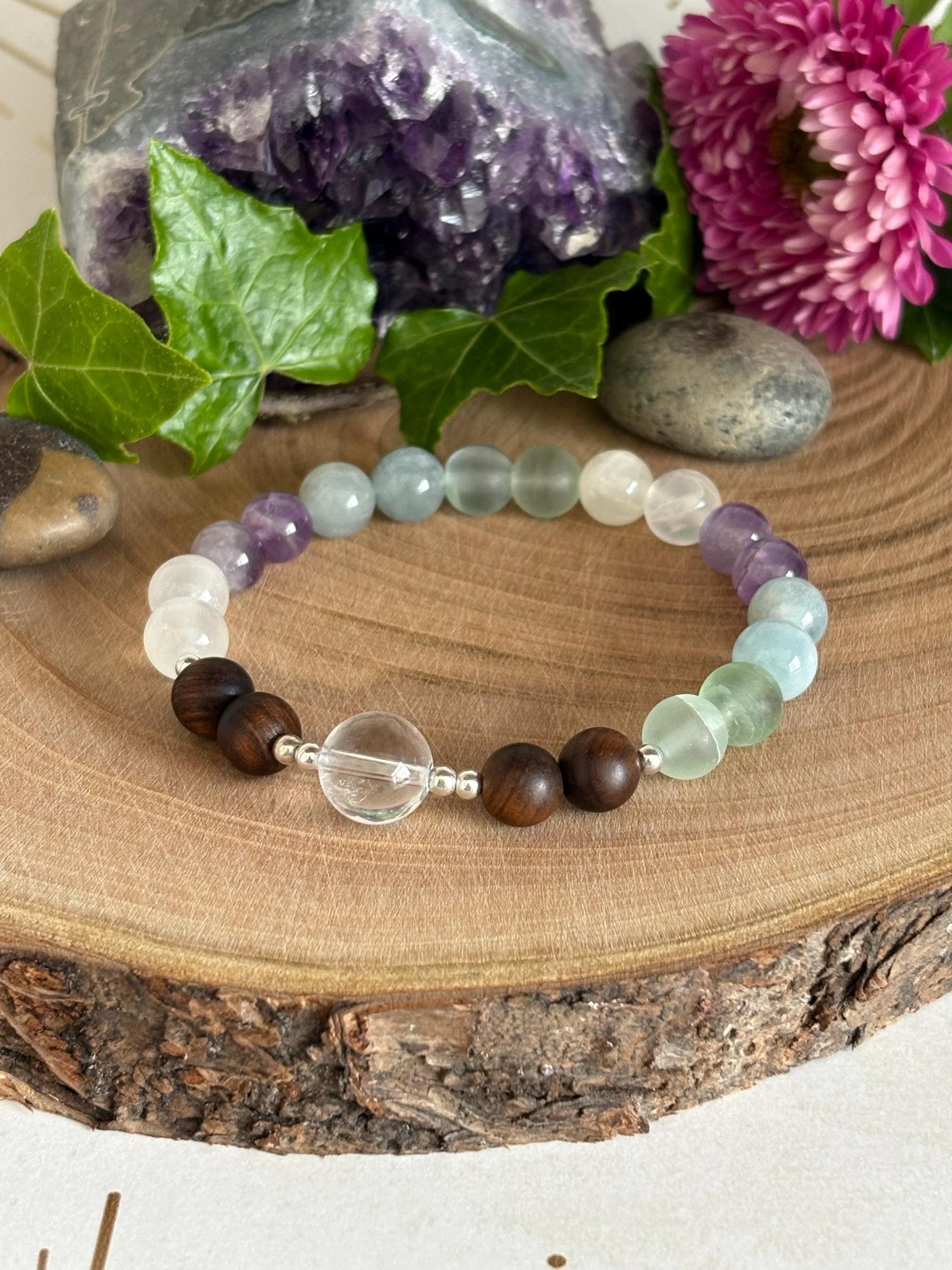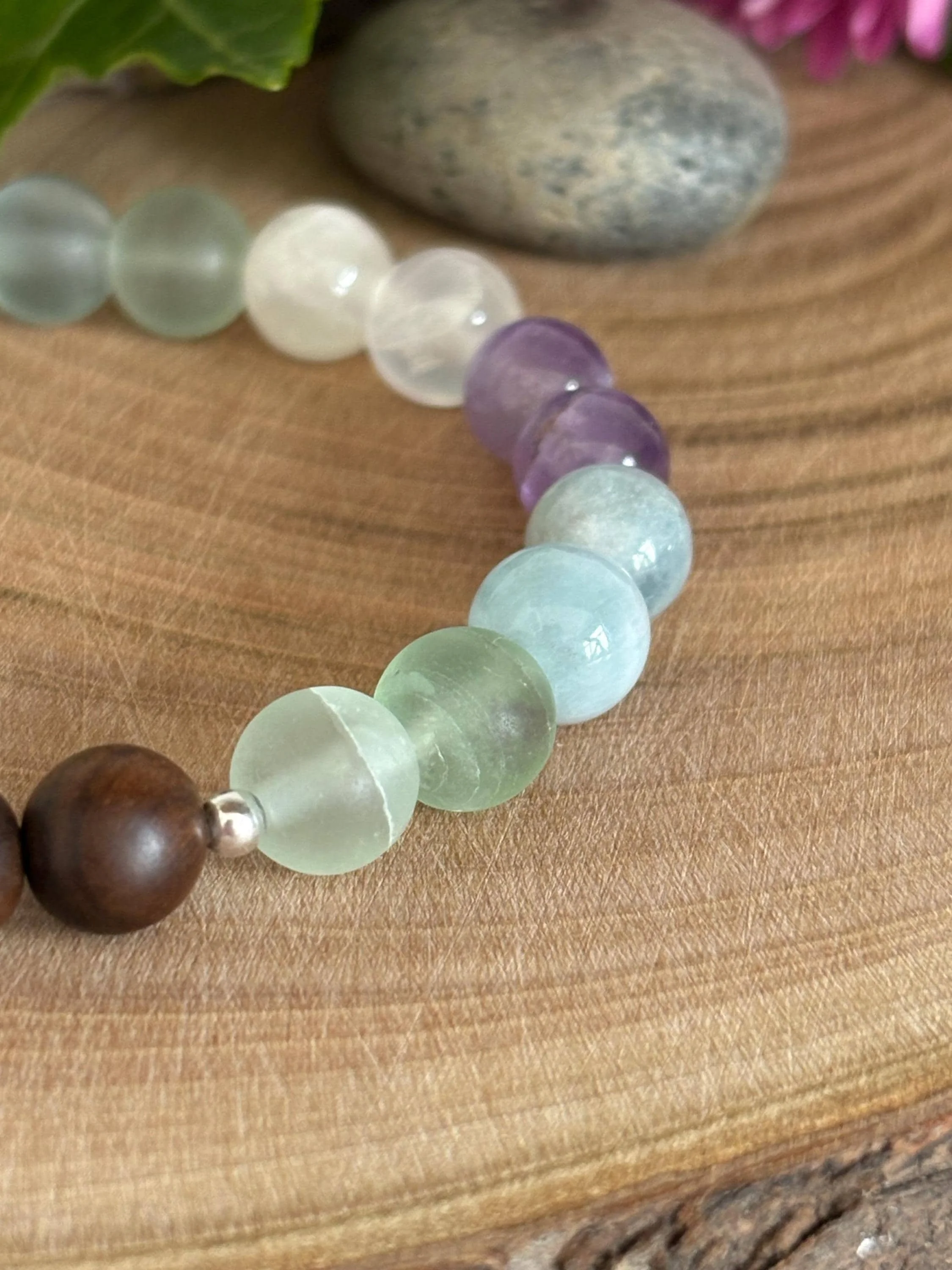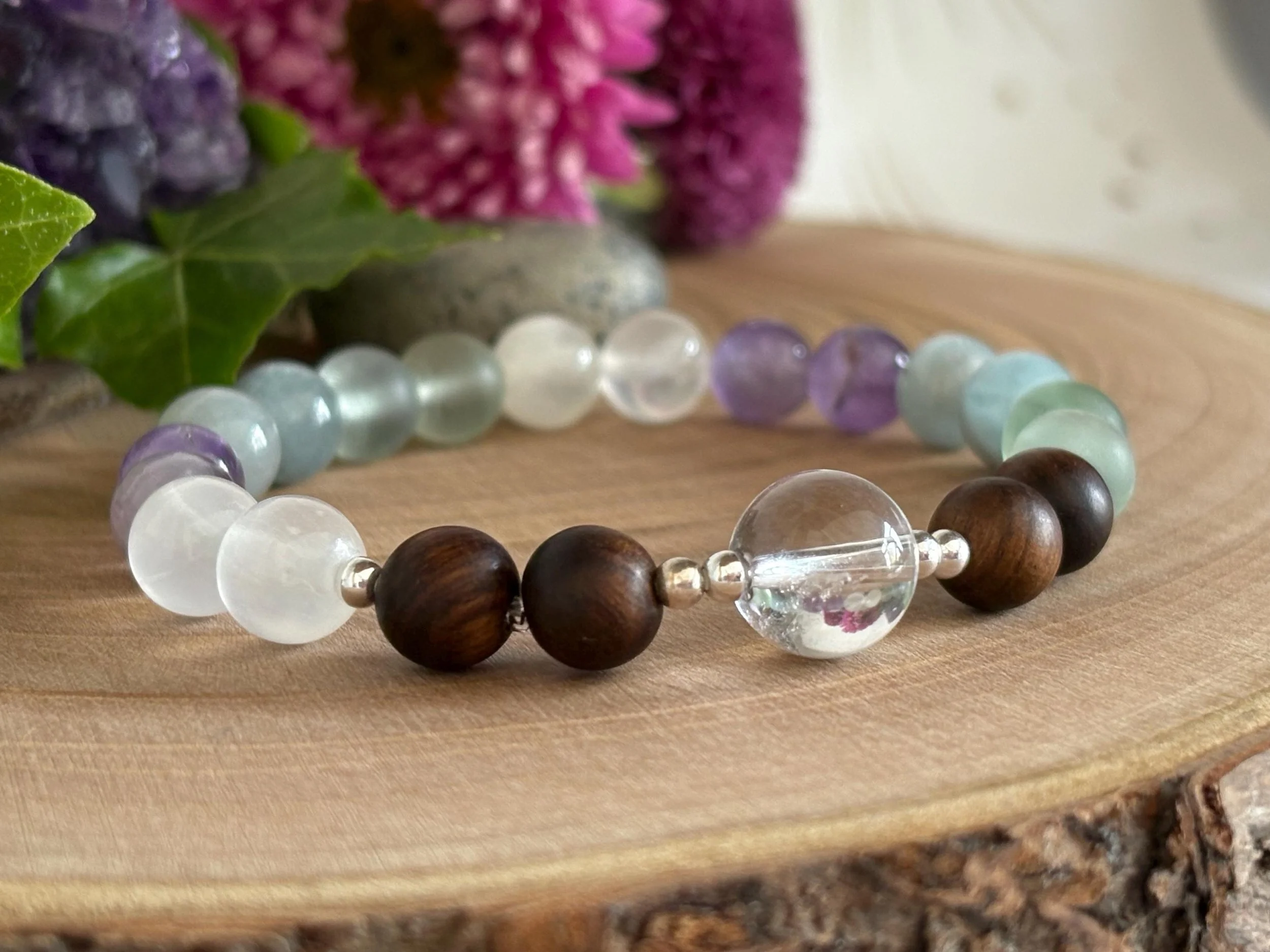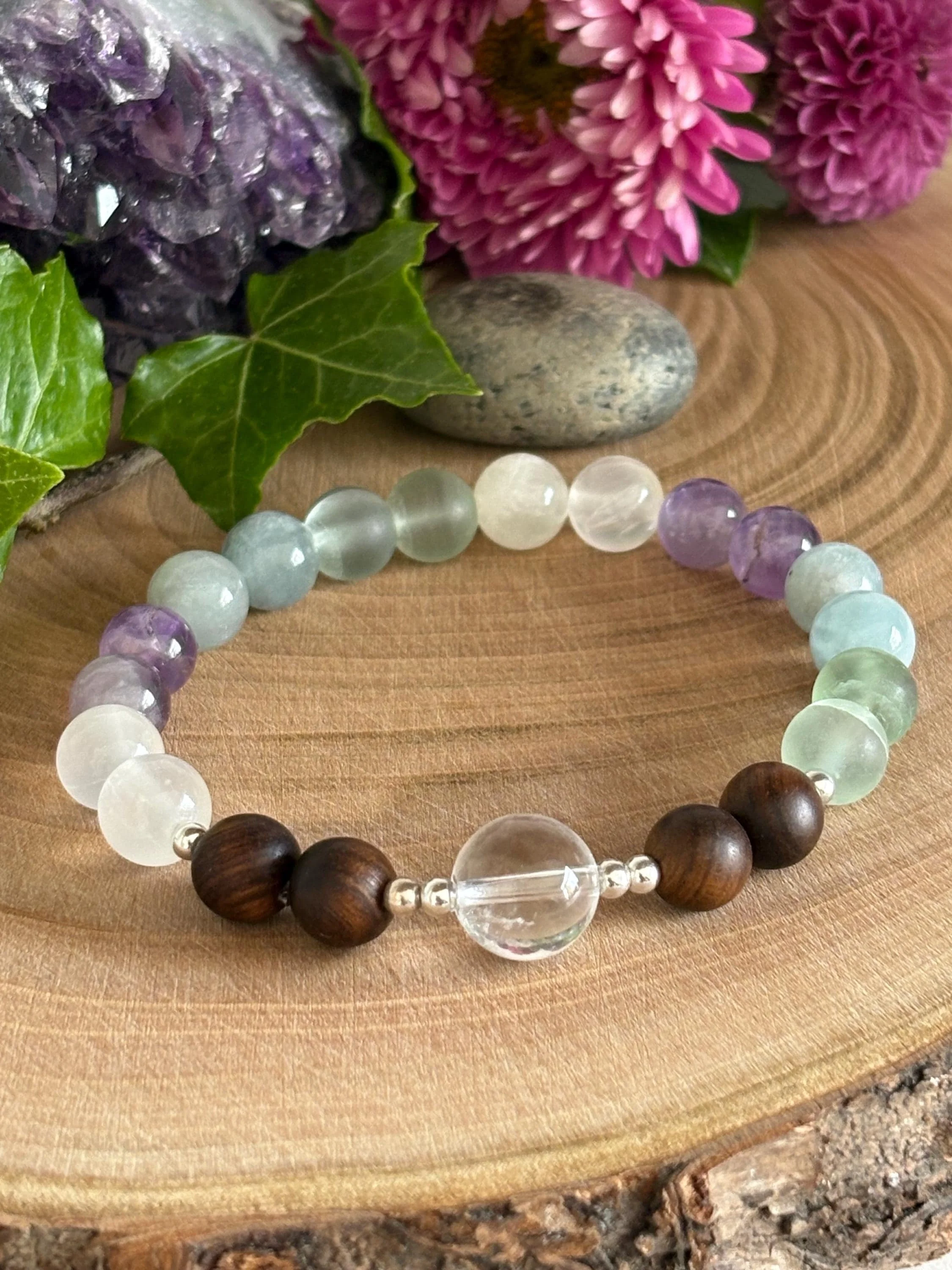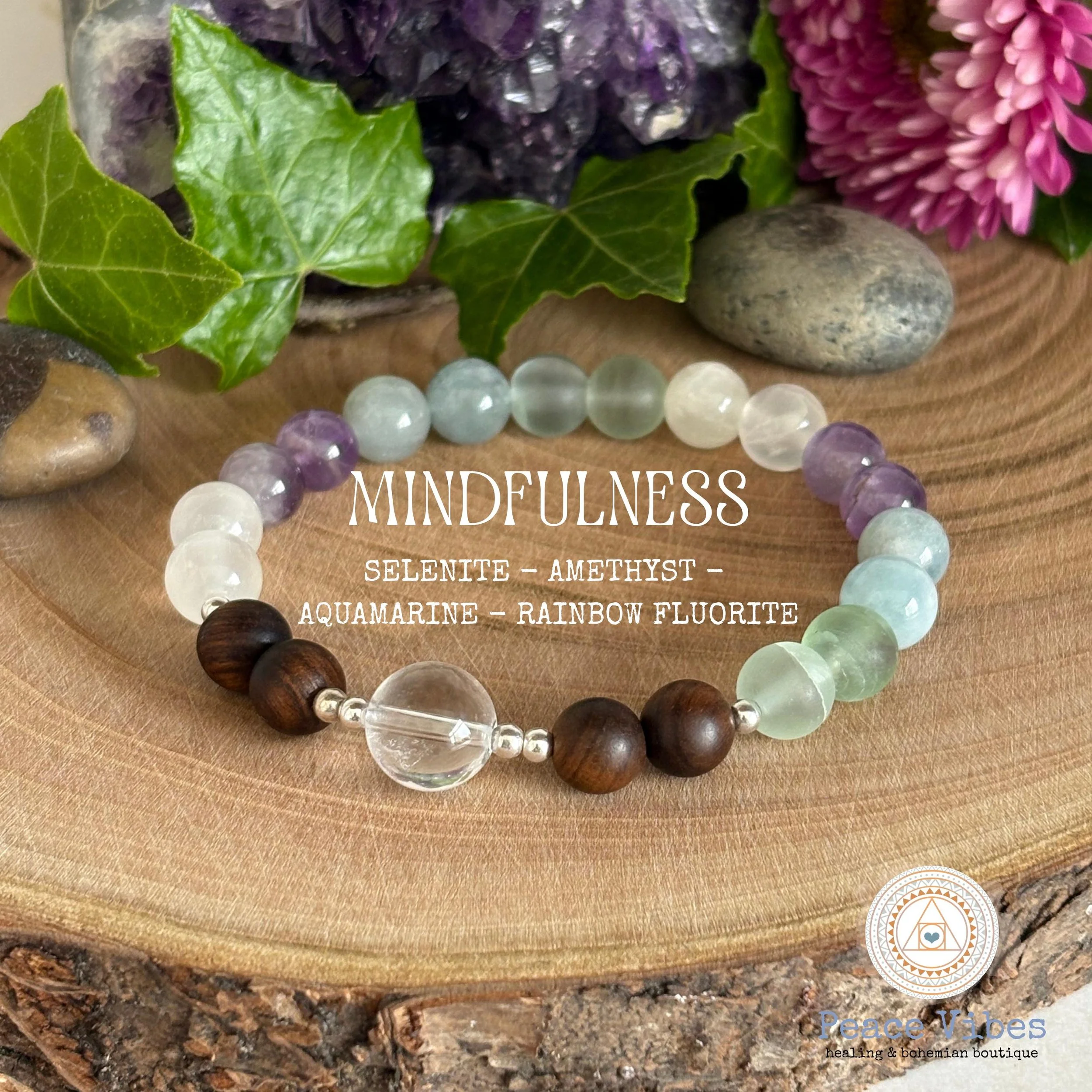 ✔️ Made with A Grade quality 8mm round gemstone beads in selenite, amethyst, aquamarine and rainbow fluorite, all stones said to holistically support** those wanting to practice mindfulness.