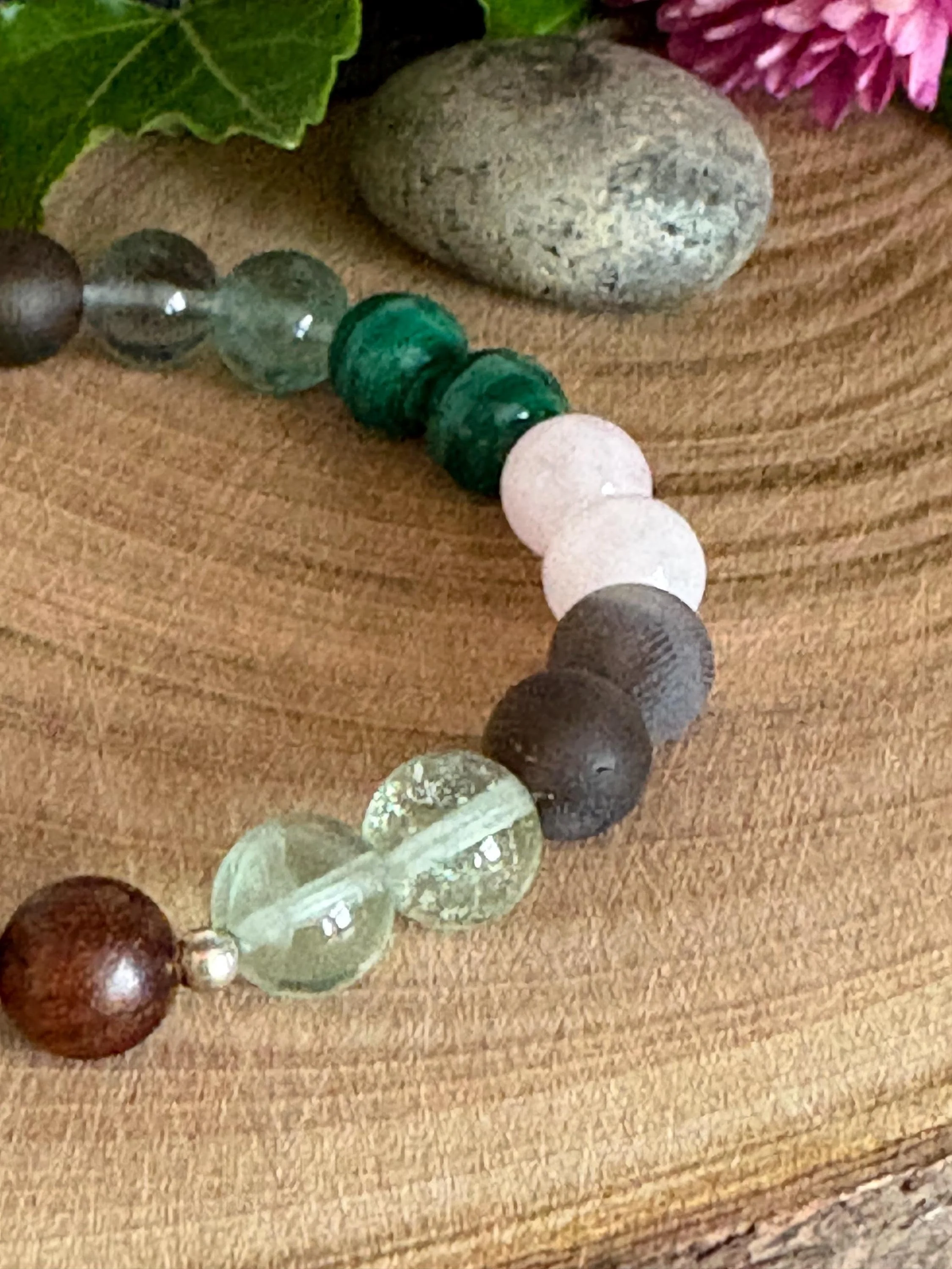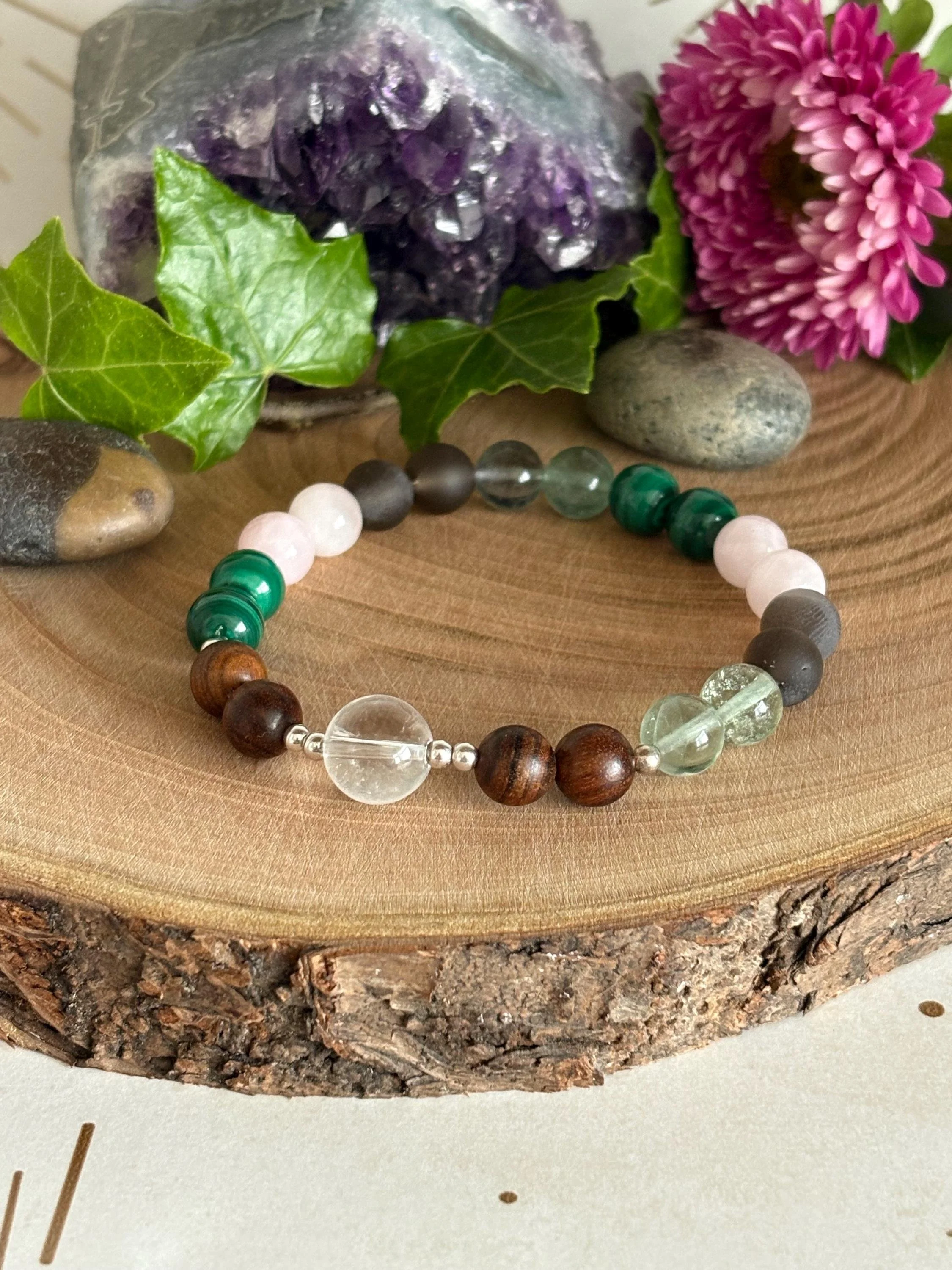 ✔️ Made with A Grade quality 8mm round gemstone beads in malachite, rose quartz, smoky quartz and rainbow fluorite, all stones said to holistically support** elements of cancer or cancer treatment in numerous ways