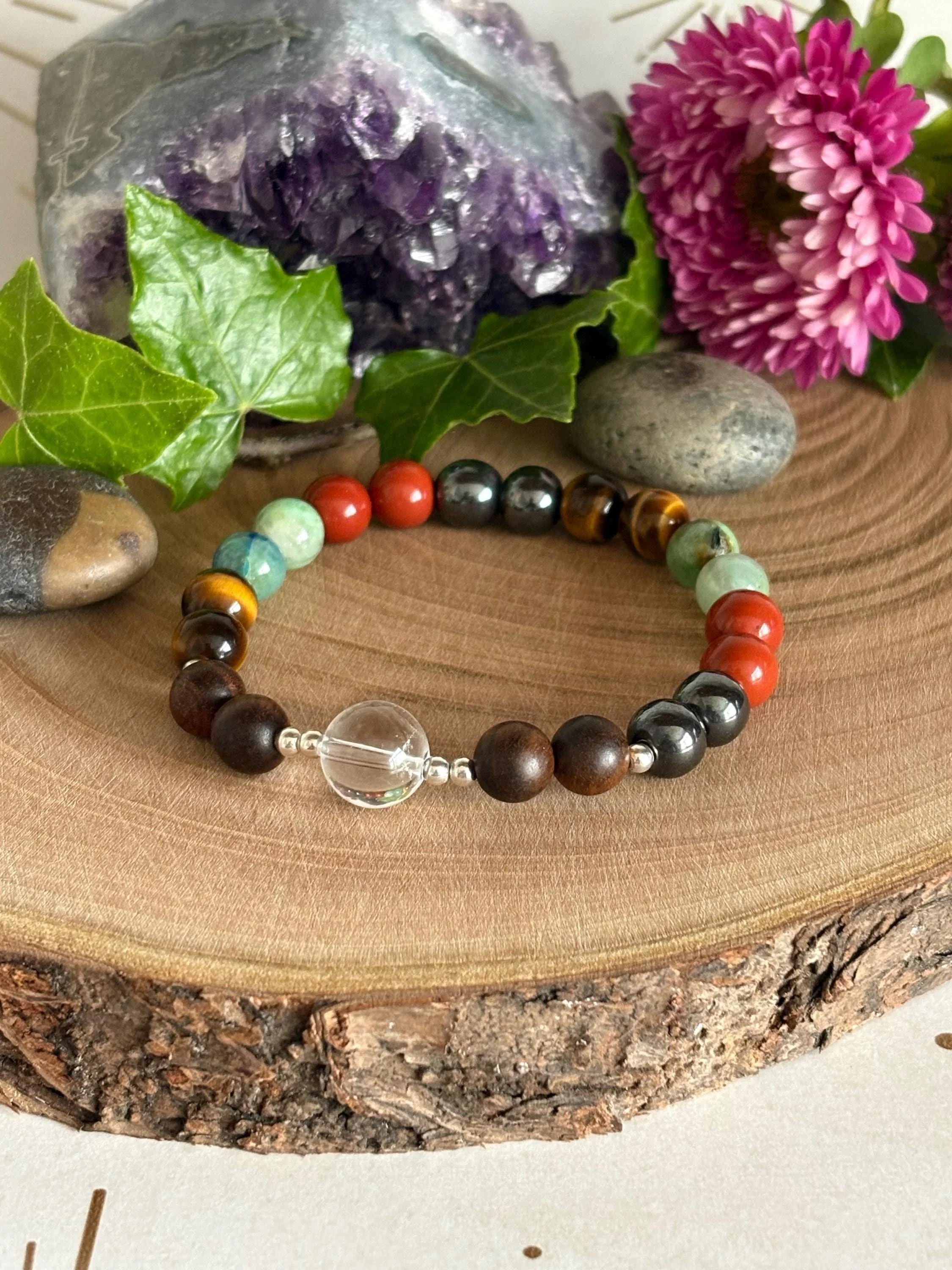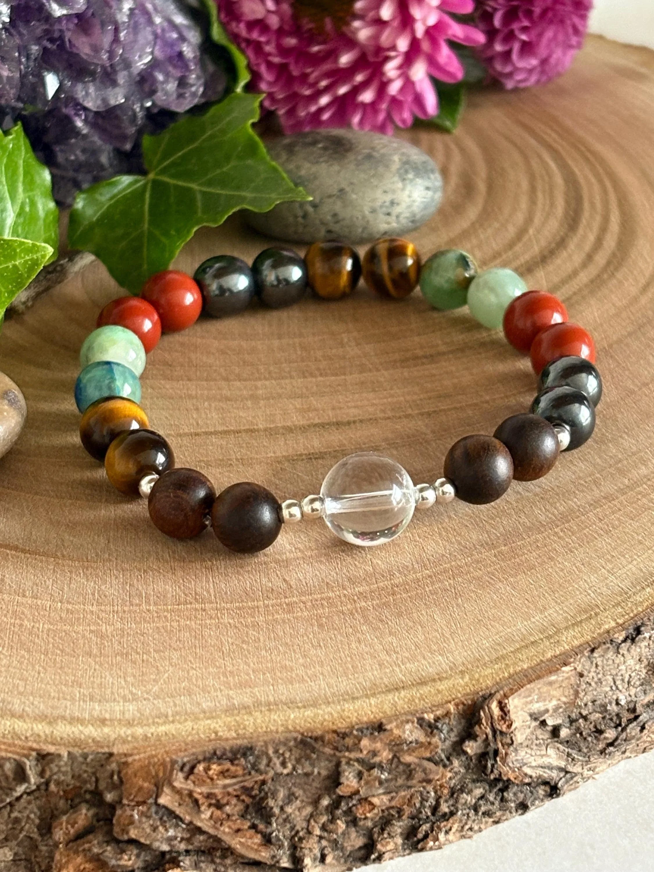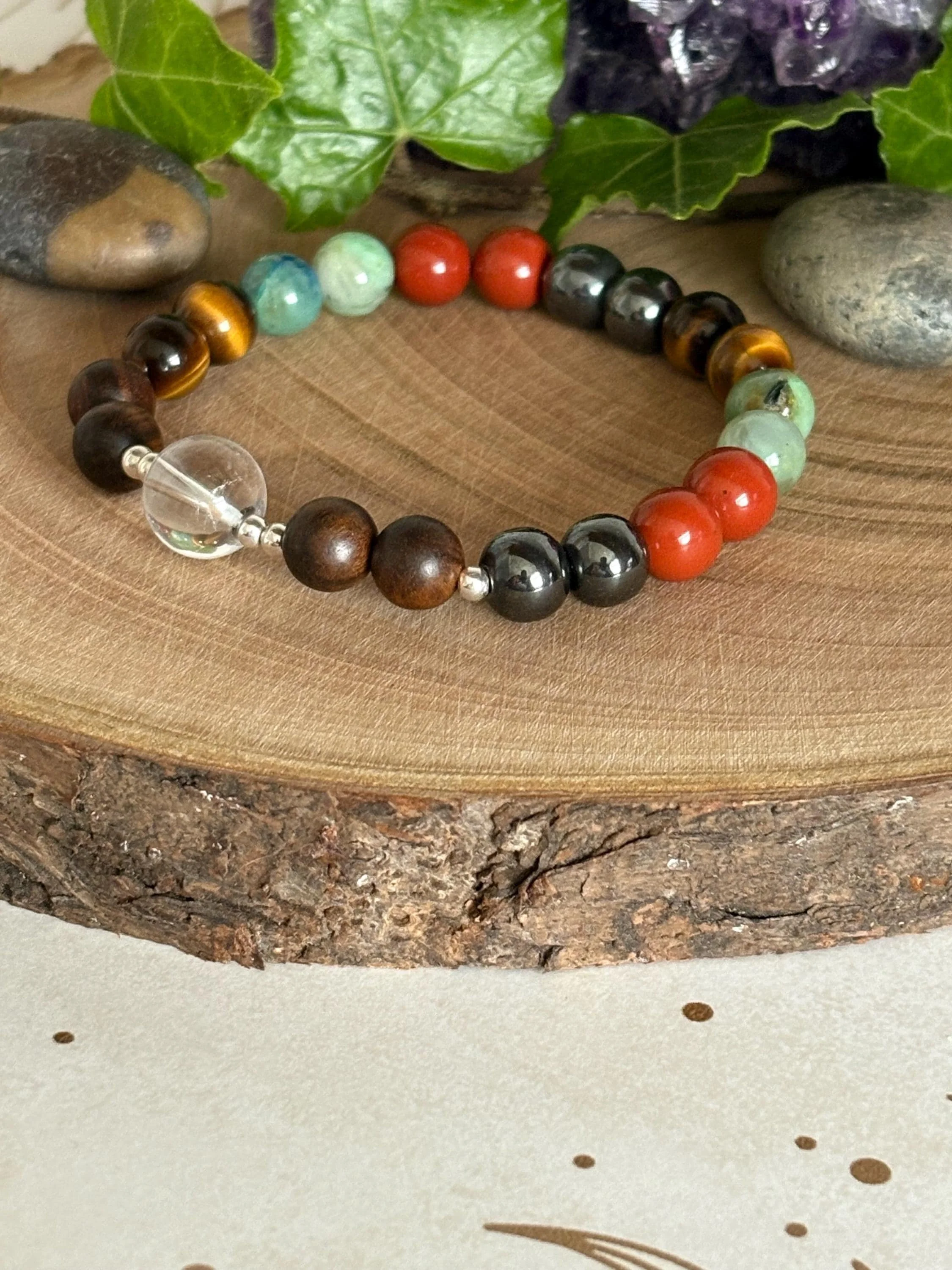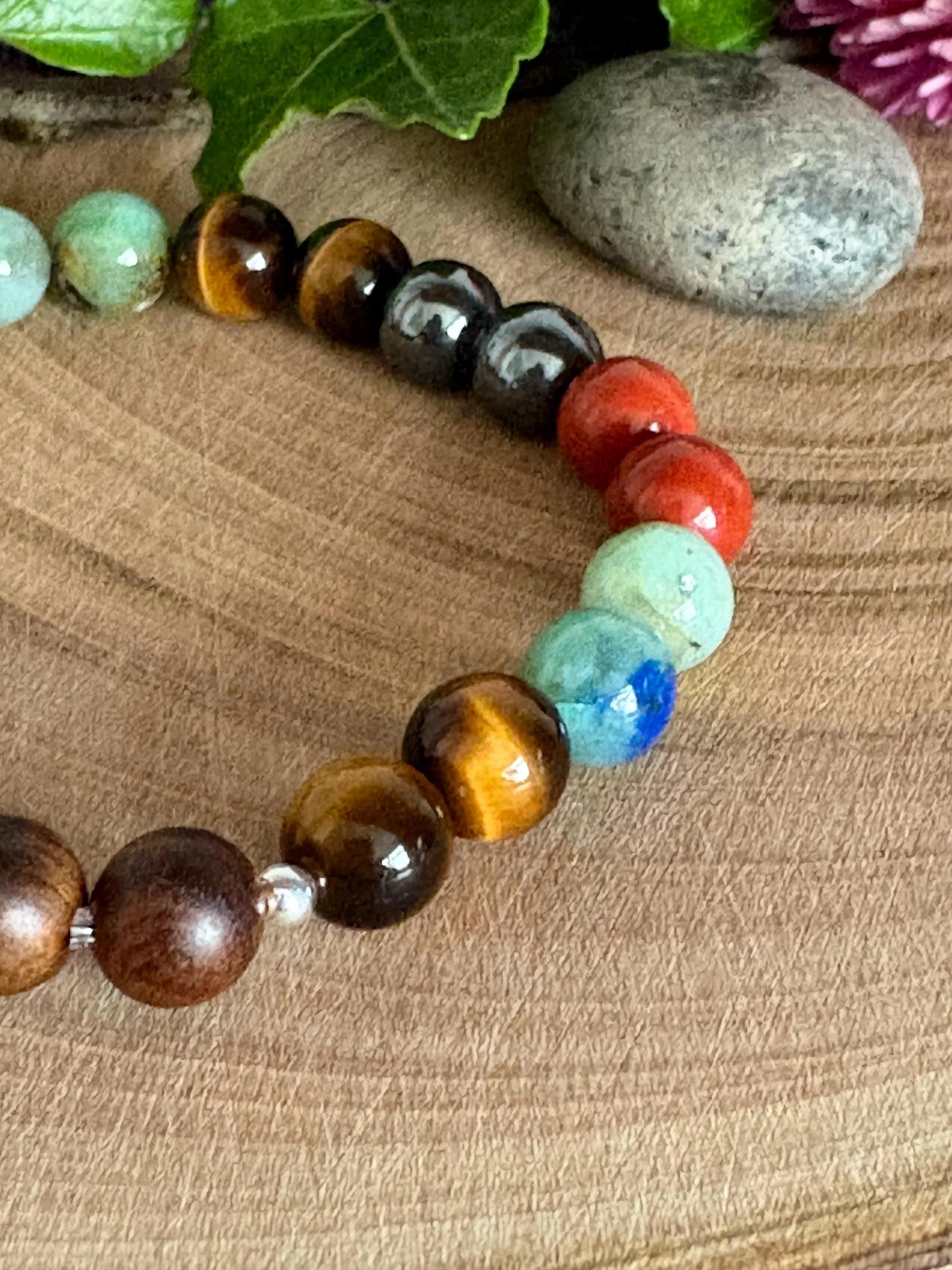 ✔️ Made with A Grade quality 8mm round gemstone beads in tigers eye, chrysocolla, red jasper and hematite, all stones said to holistically support** pain in numerous ways