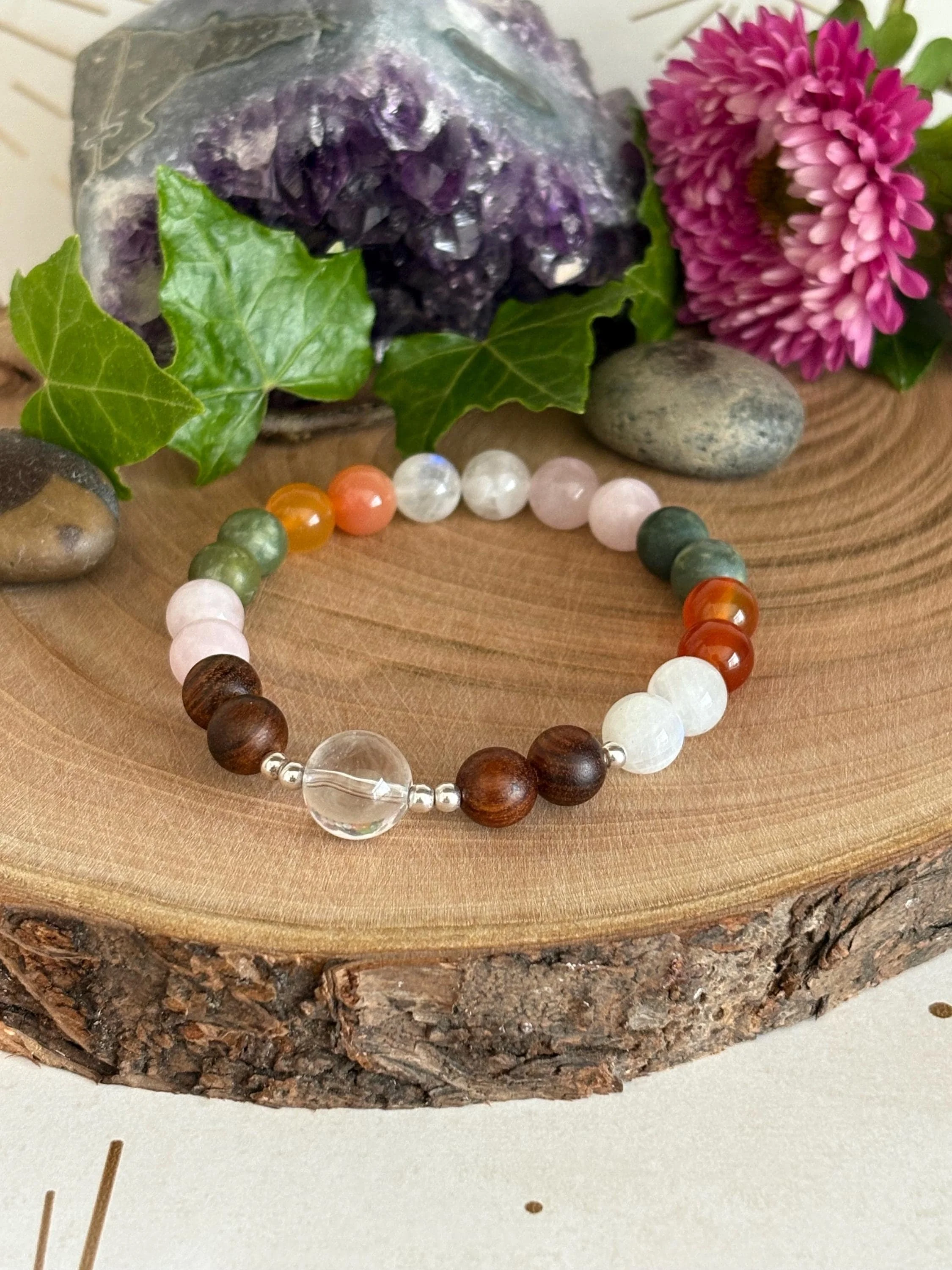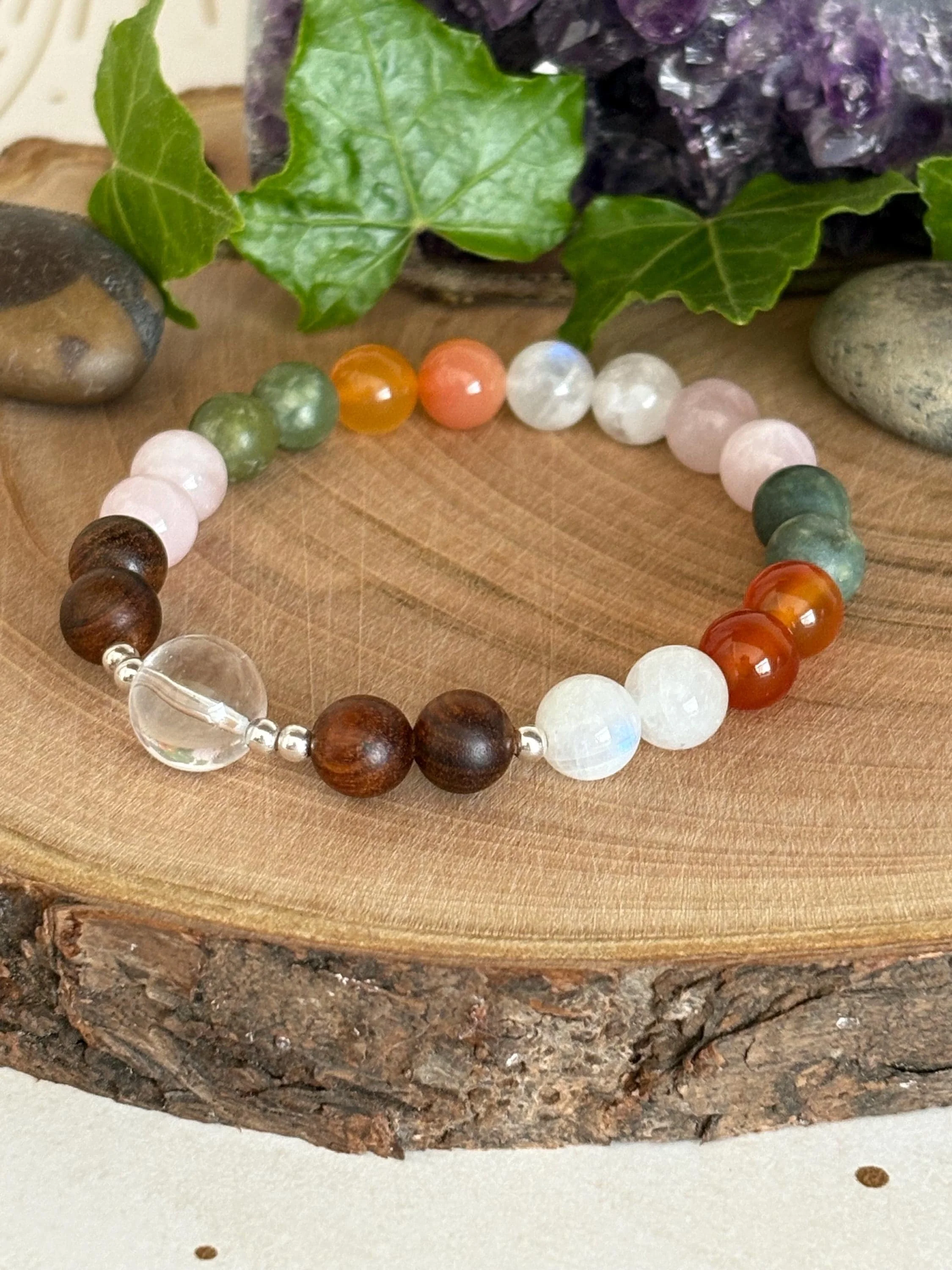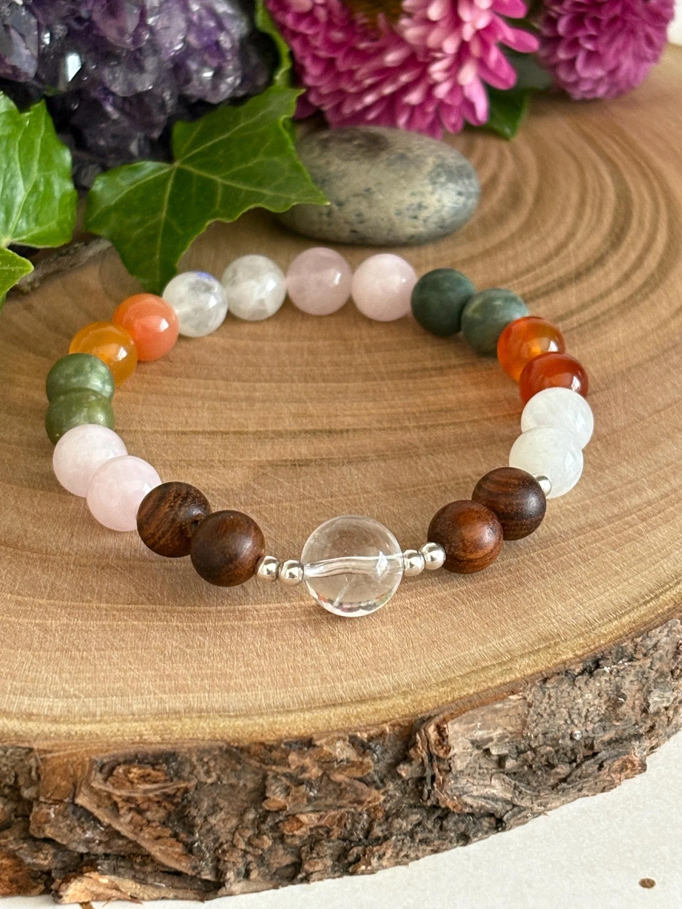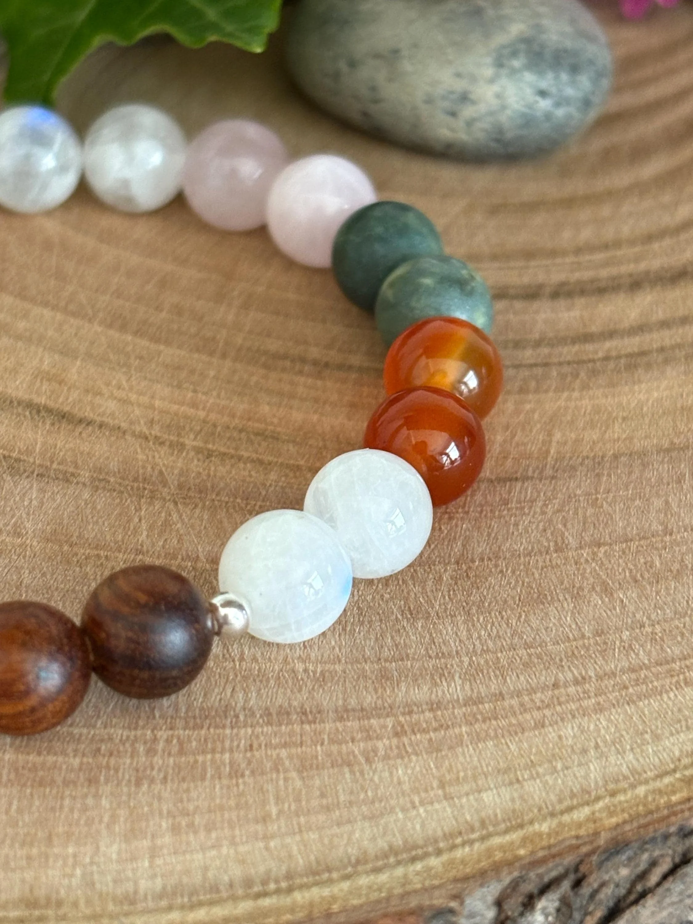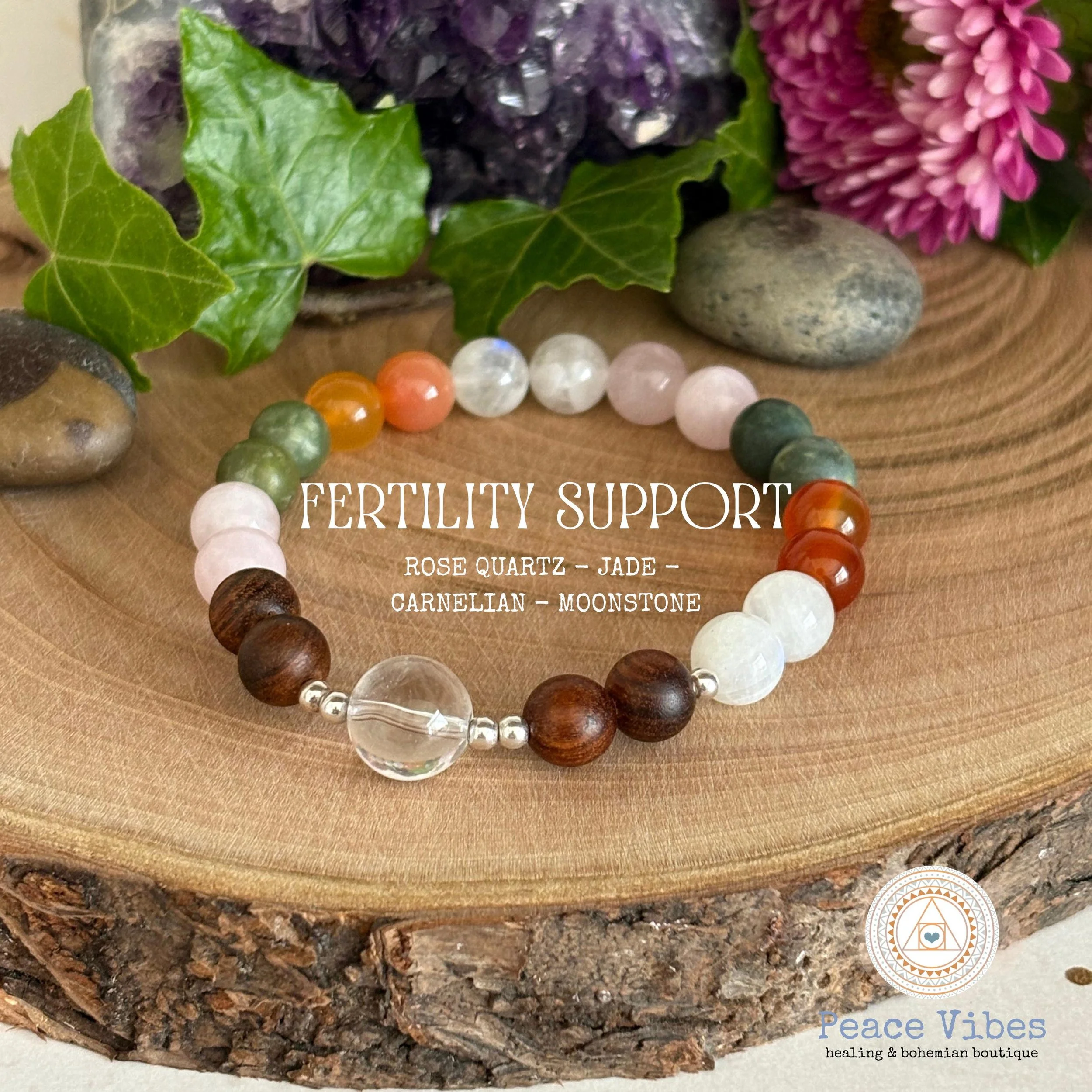 ✔️ Made with A Grade quality 8mm round gemstone beads in rose quartz, jade, carnelain and moonstone all stones said to holistically support** those who would like to go deeper in their healing journey towards a healthy pregnancy.