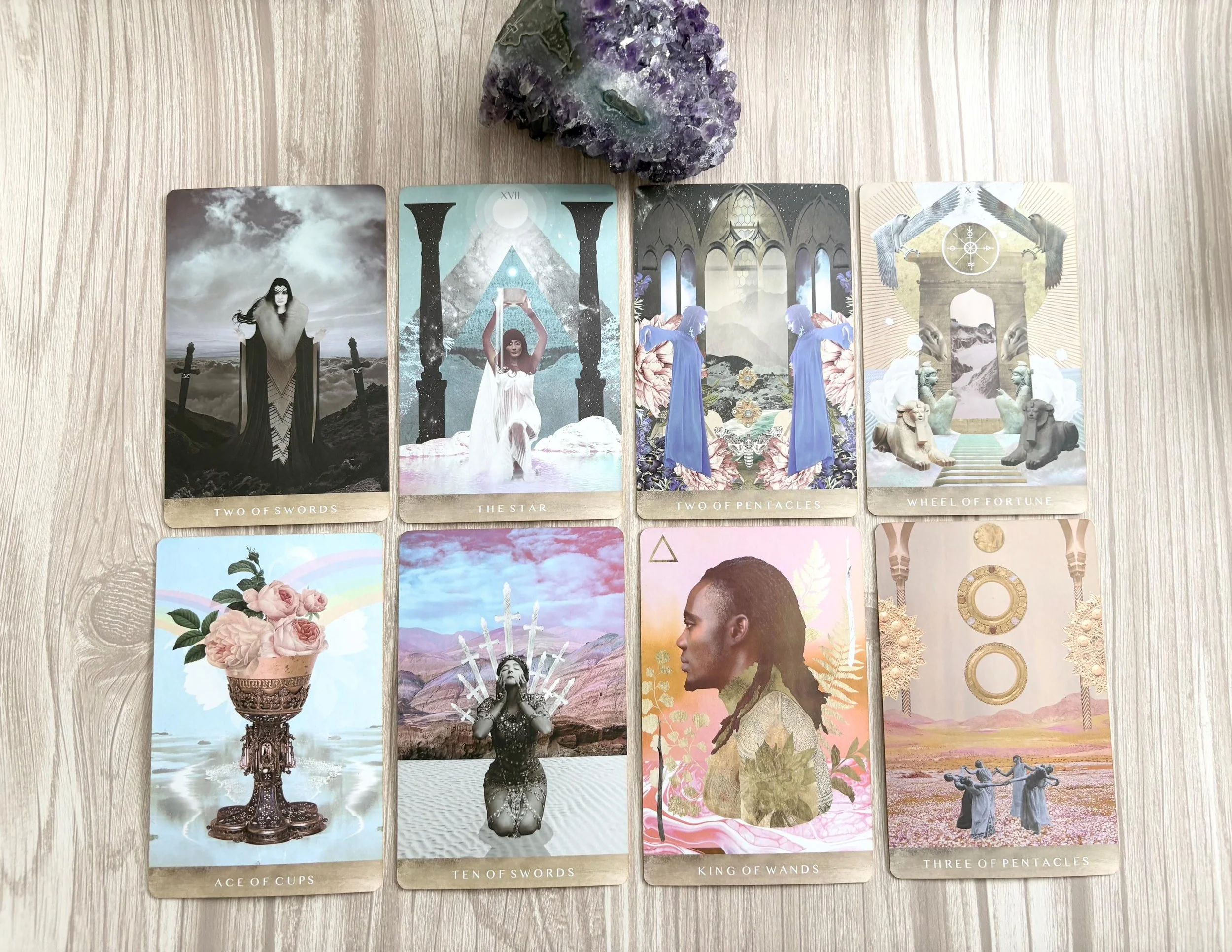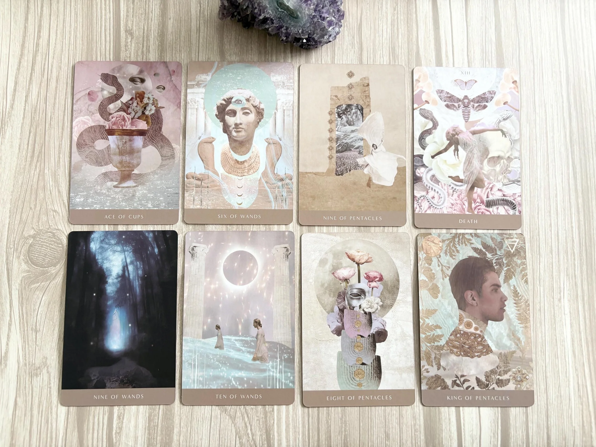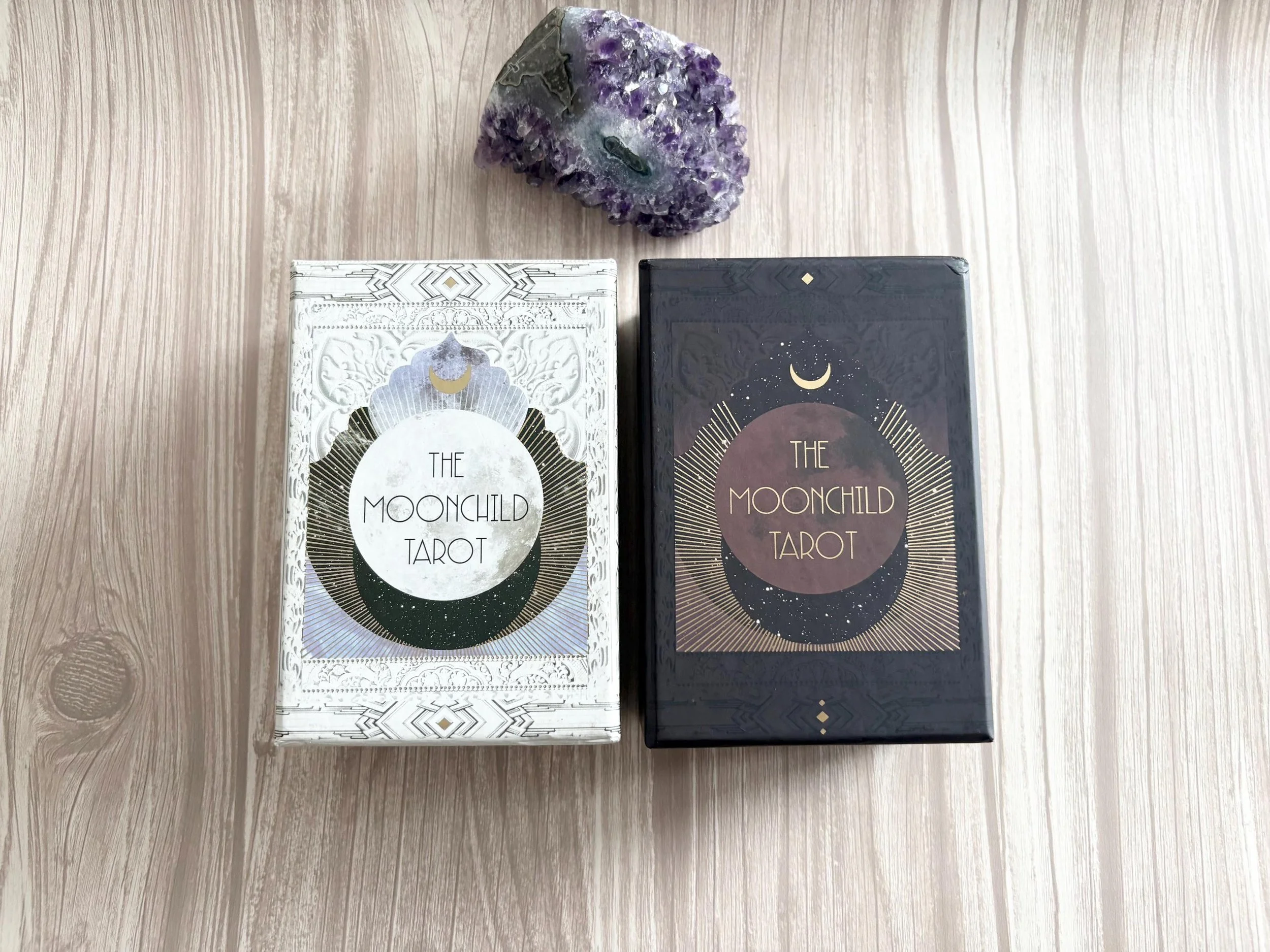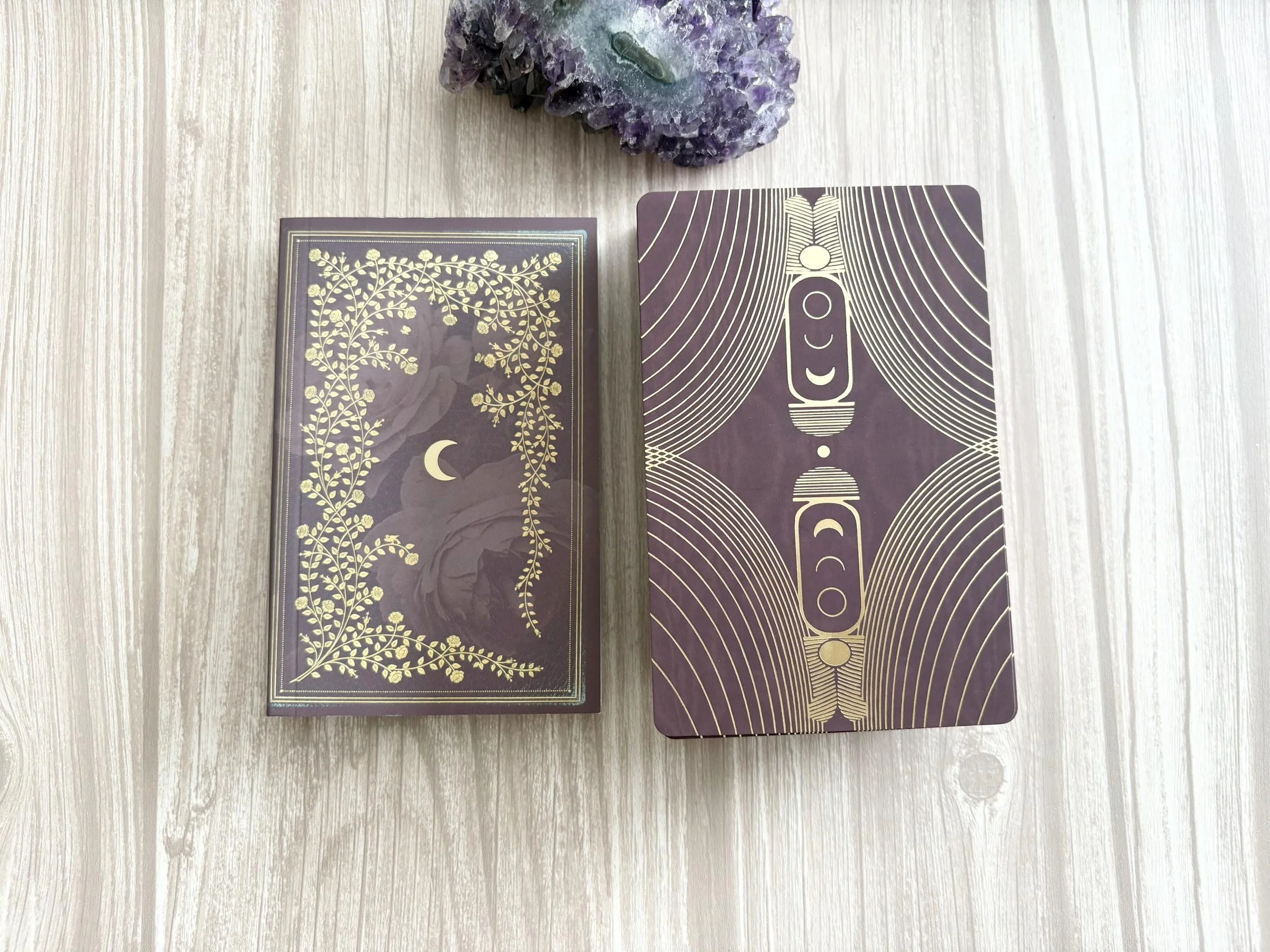 This listing is for the gorgeous Moon Child tarot by Danielle Noel. You can choose to have the original edition, which is the light edition with gold edging. The shadow edition with purple edging or both decks. Please note these are from my personal collection and are not vintage decks.