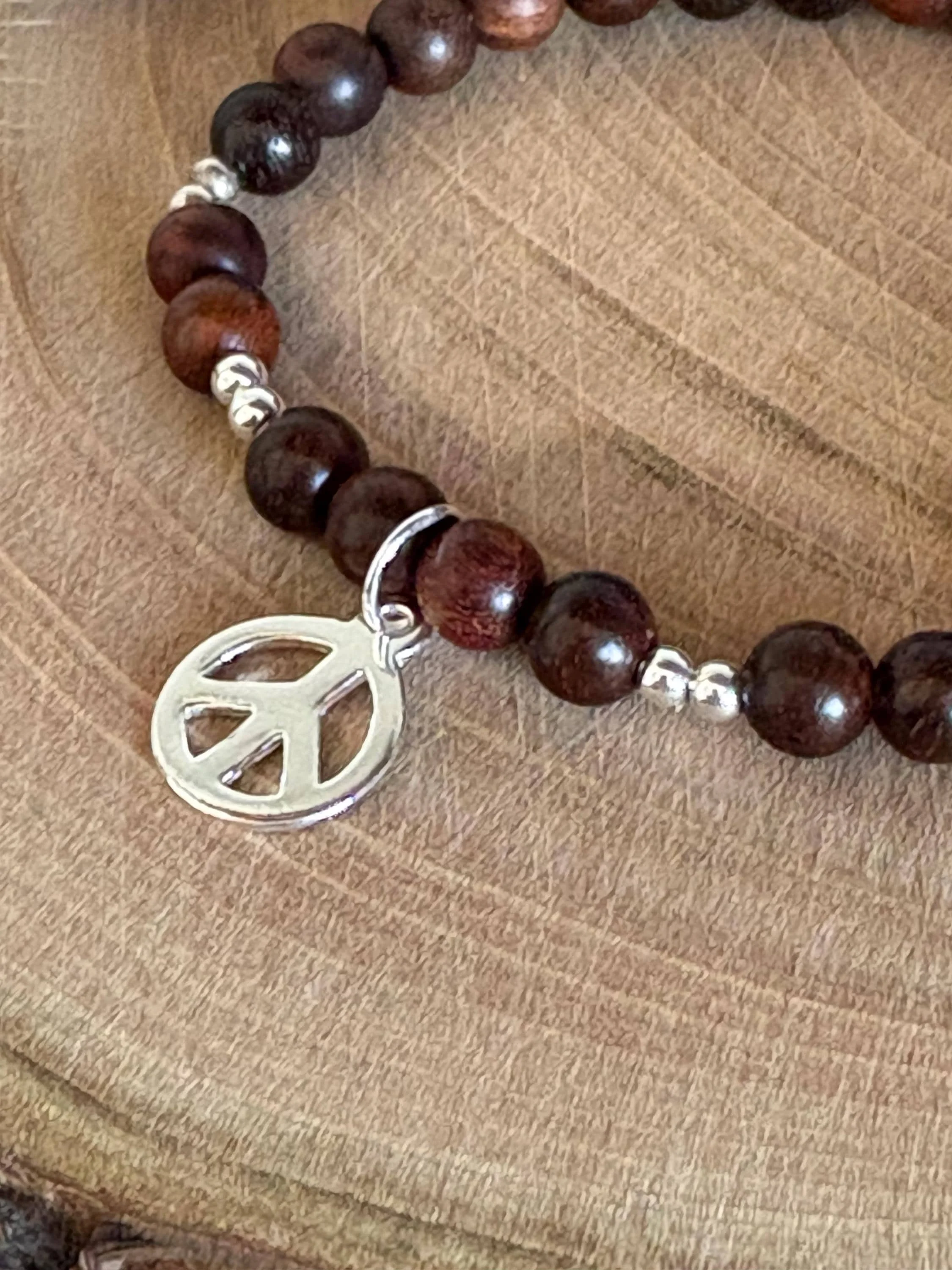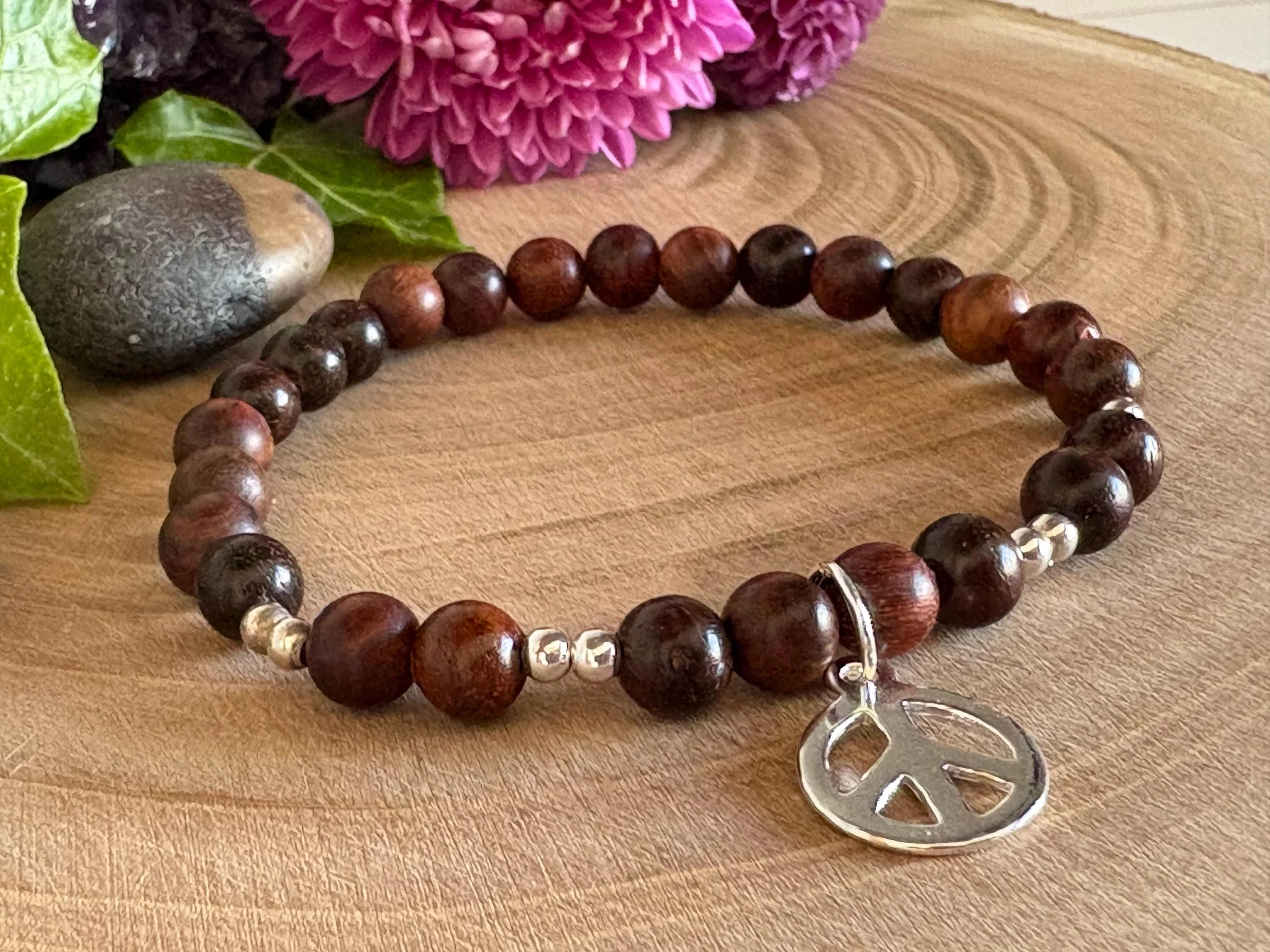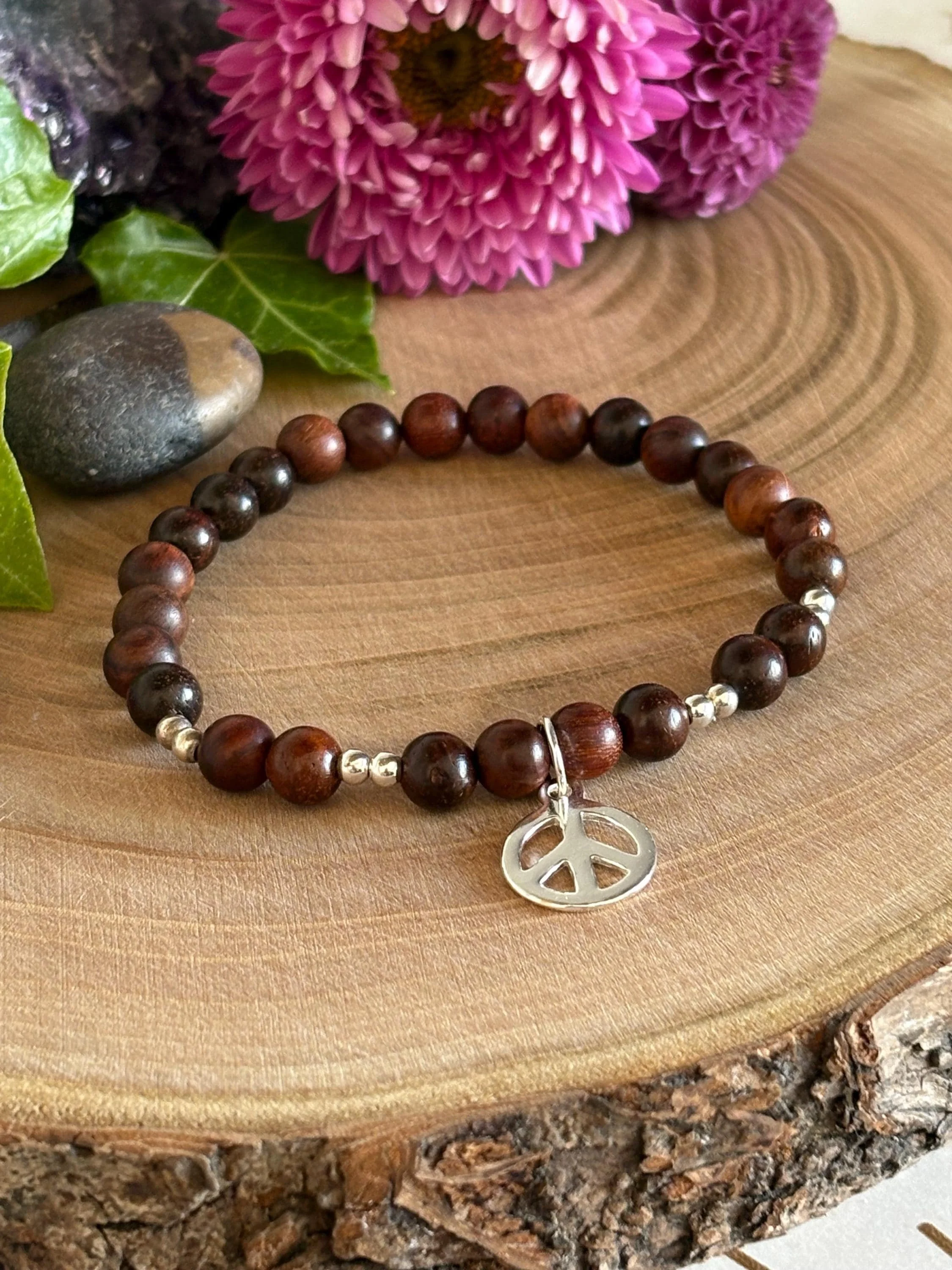 Red Sandalwood & Sterling Silver Peace Sign 6mm Bracelet | Sandalwood Bracelet | Peace Sign Bracelet | 6mm Wood Mala Bracelet | Unisex