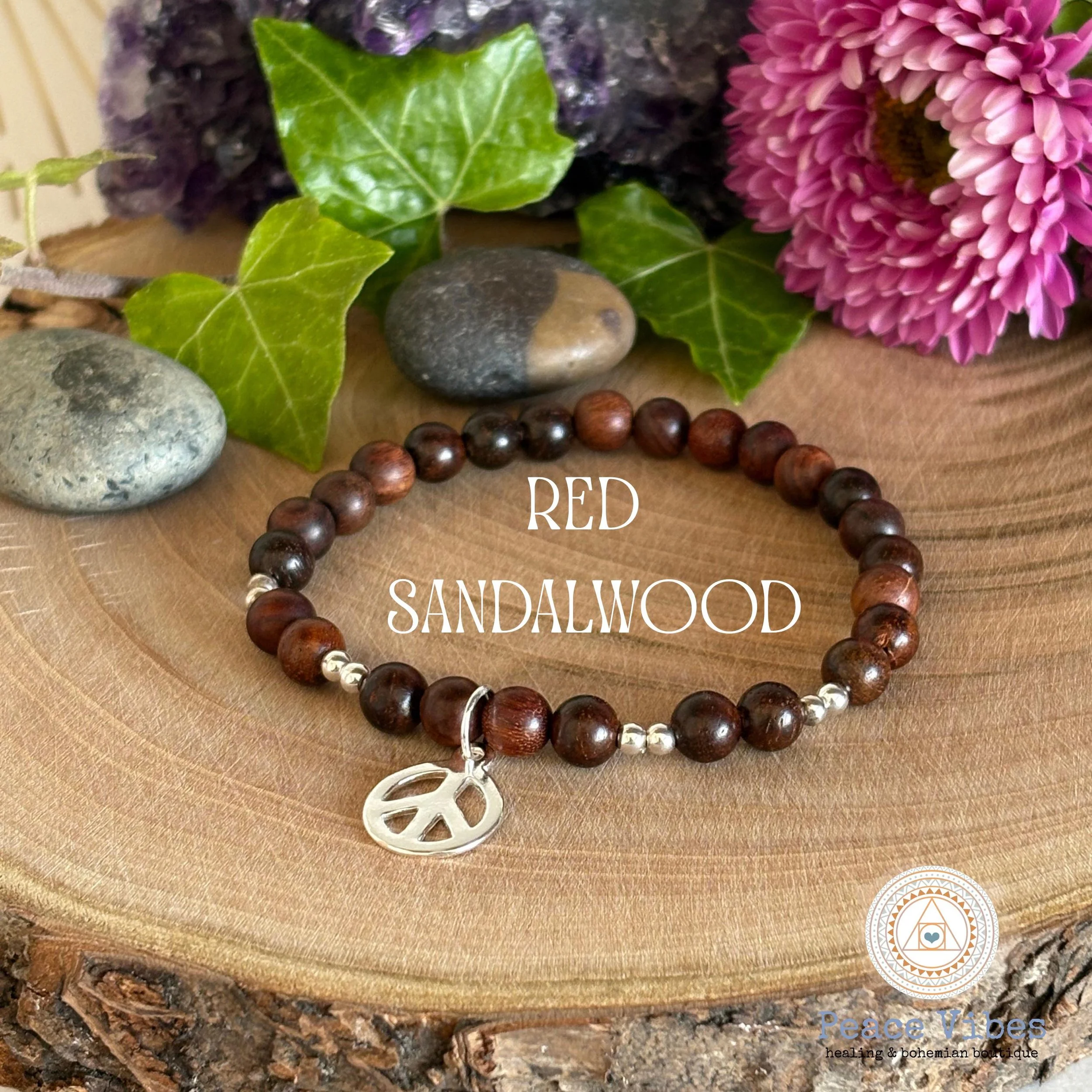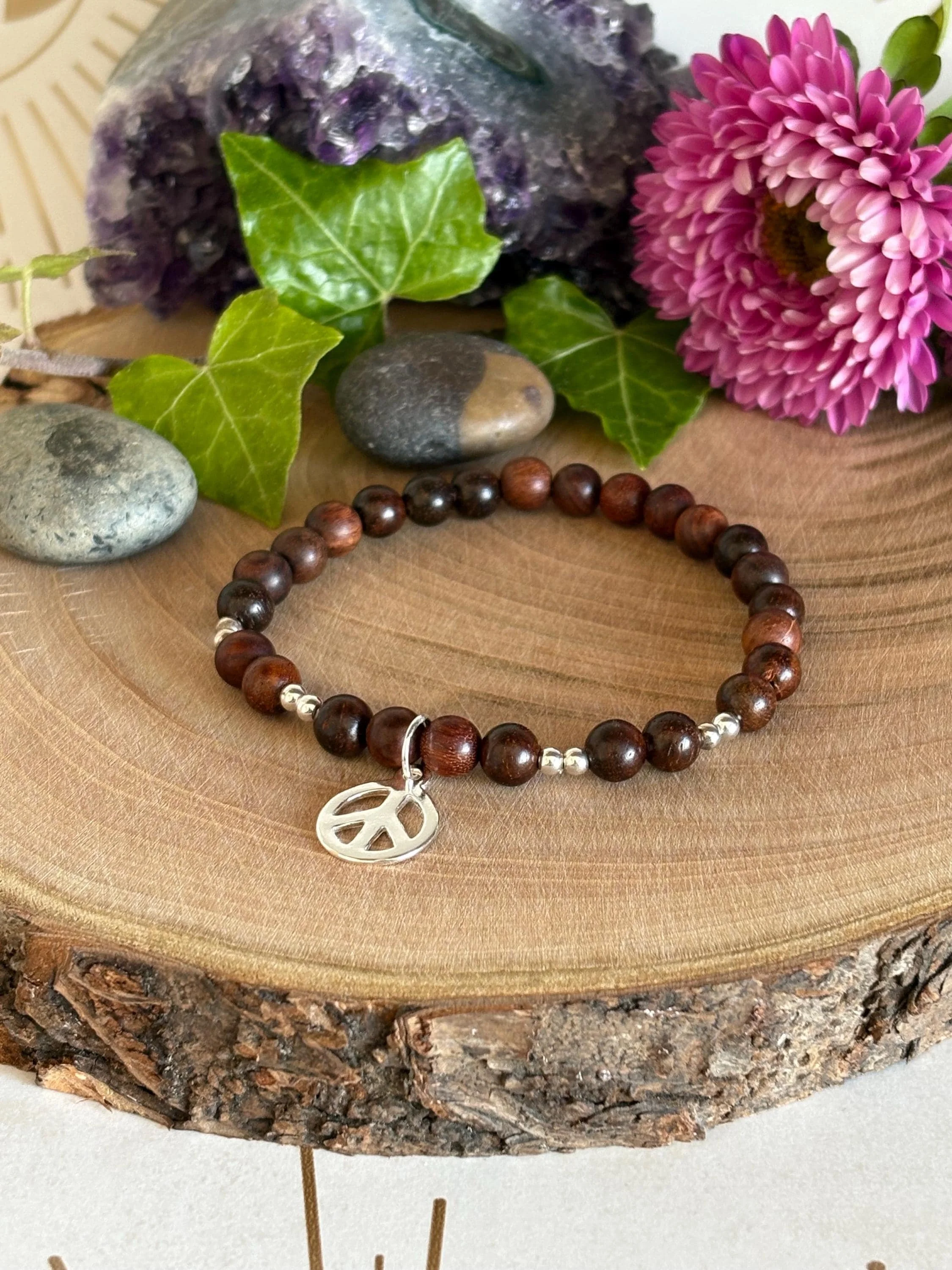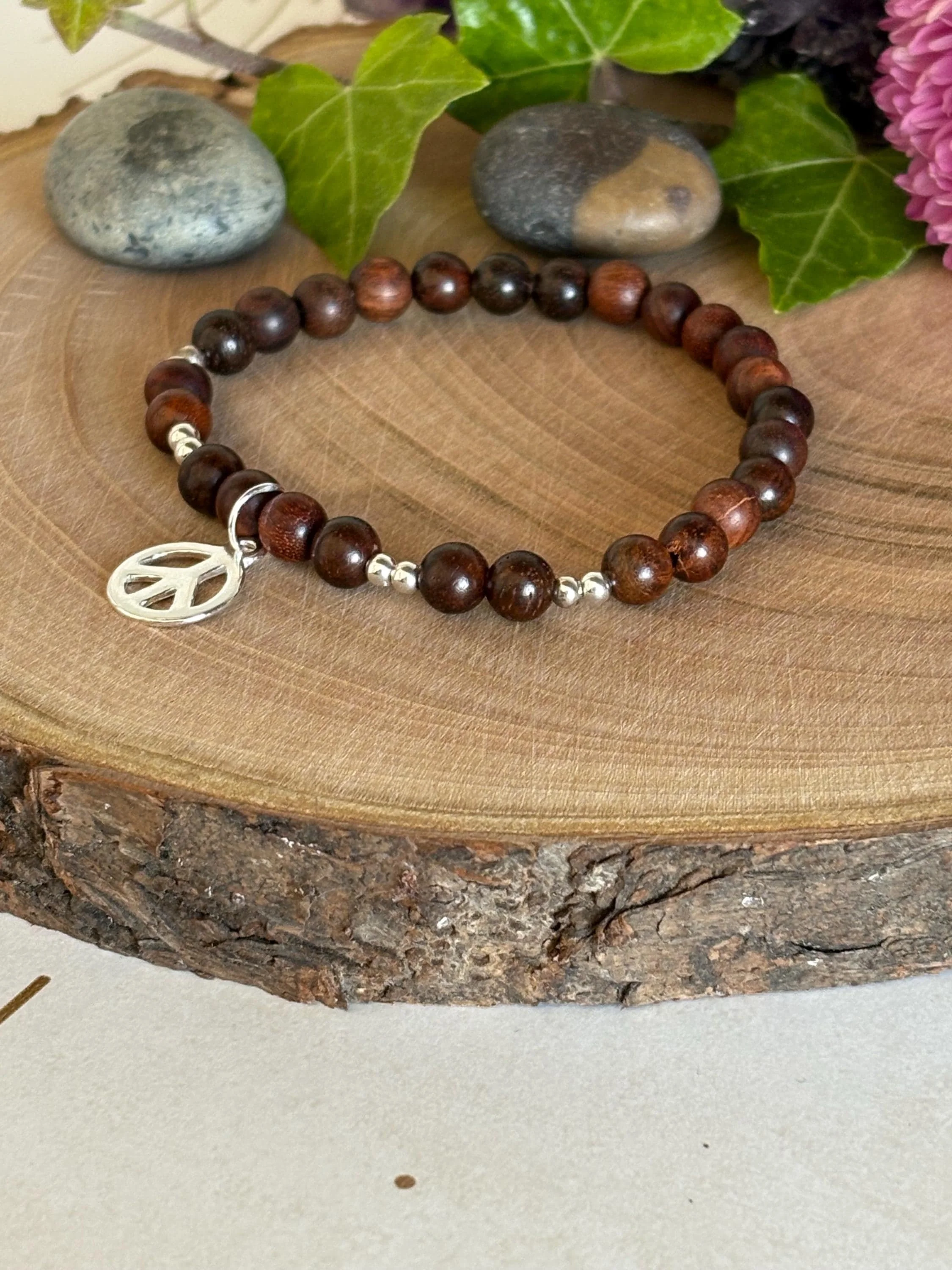 Red Sandalwood & Sterling Silver Peace Sign 6mm Bracelet | Sandalwood Bracelet | Peace Sign Bracelet | 6mm Wood Mala Bracelet | Unisex