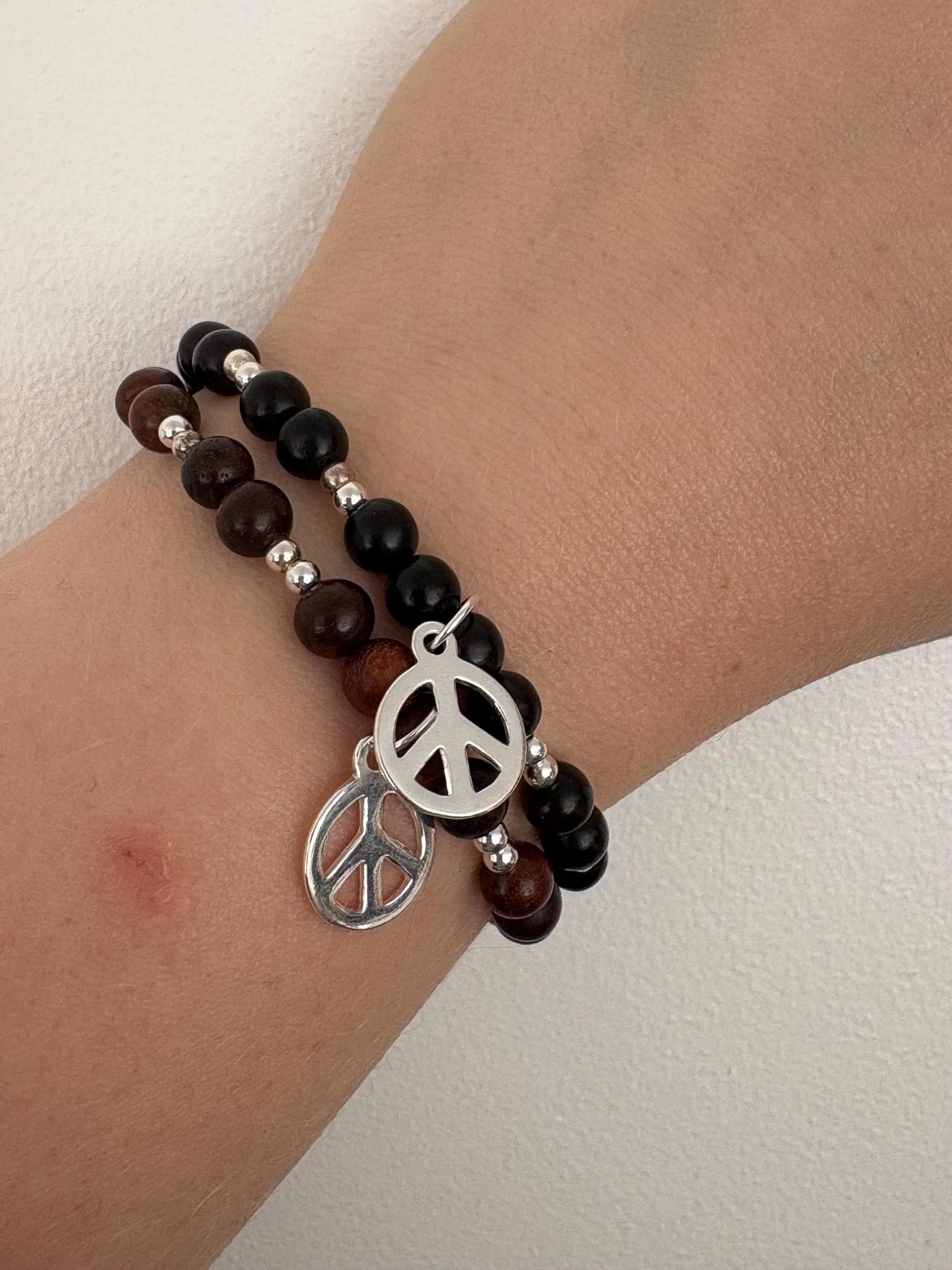 Gorgeous and unique bohemian style peace sign sandalwood stretch bracelet accented with sterling silver beads is the perfect companion for any outfit.