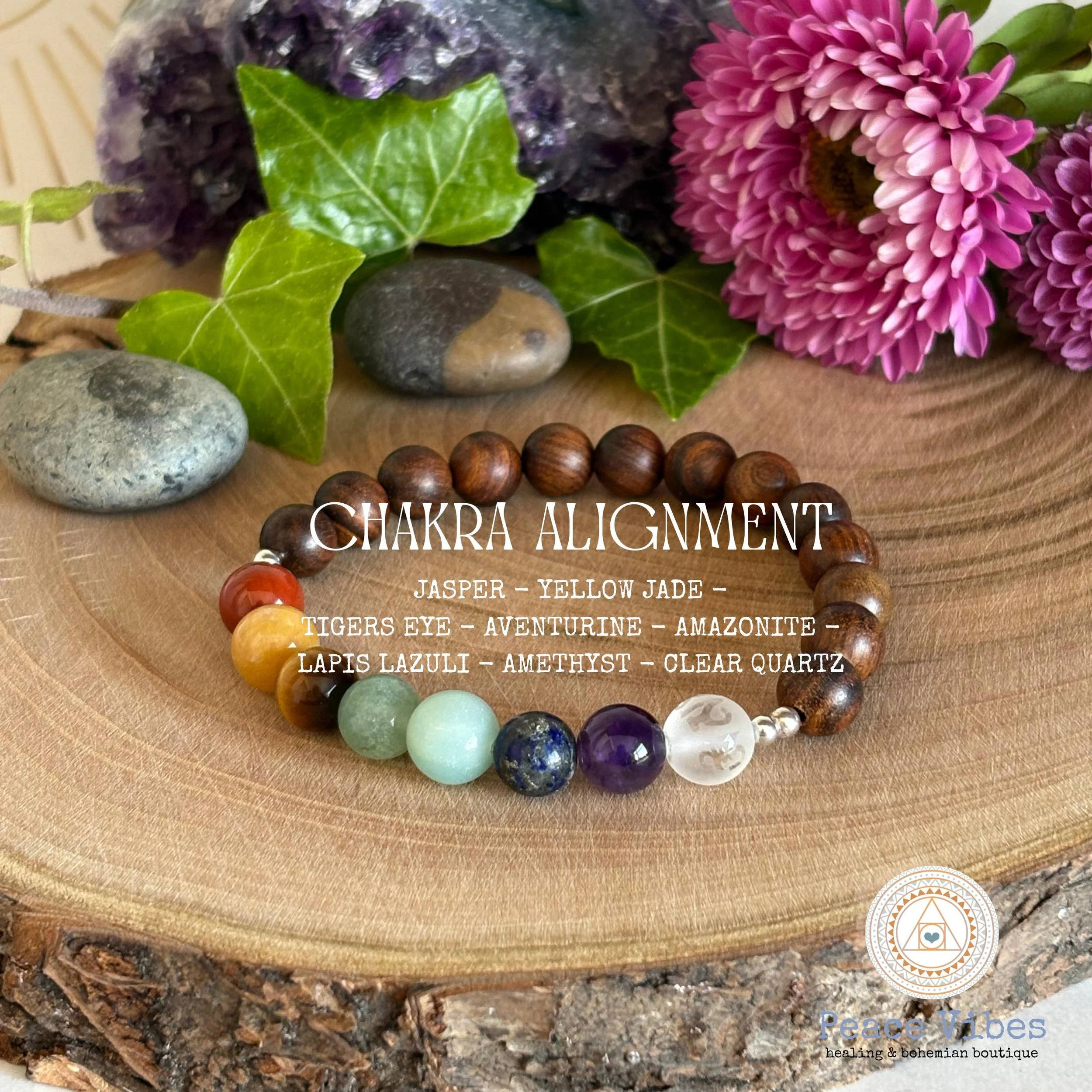 ✔️ Made with A Grade quality 8mm round gemstone beads in the traditional chakra colours which symbolise as follows: red jasper (root chakra), yellow jade (sacral chakra), tigers eye (solar plexus), green aventurine (heart chakra), amazonite (throat chakra), lapis lazuli (third eye chakra), amethyst (crown chakra).