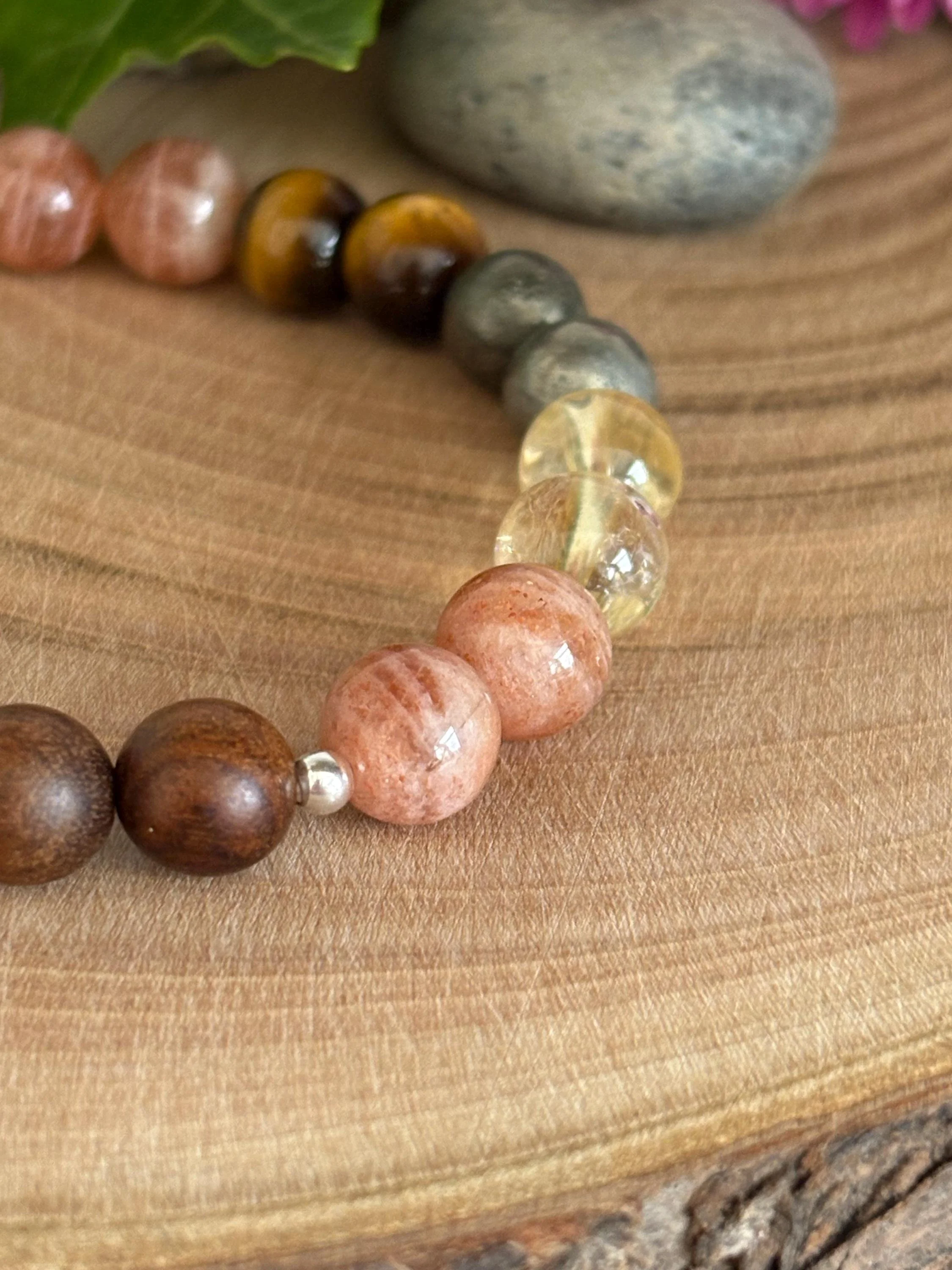 ✔️ Made with A Grade quality 8mm round gemstone beads in tigers eye, pyrite, citrine and sunstone all stones said to holistically support** those who would like to go deeper in their healing journey towards a more powerful and confident self.