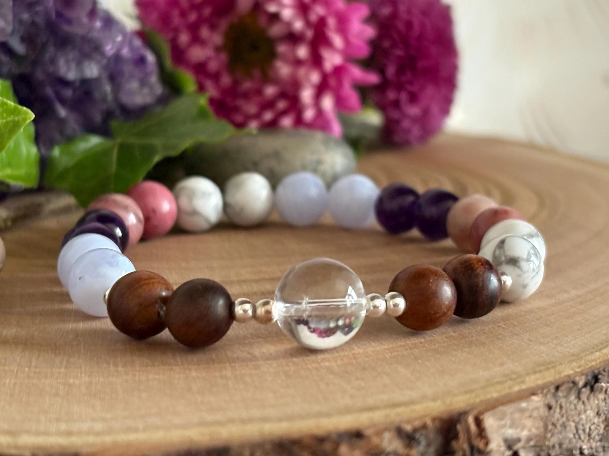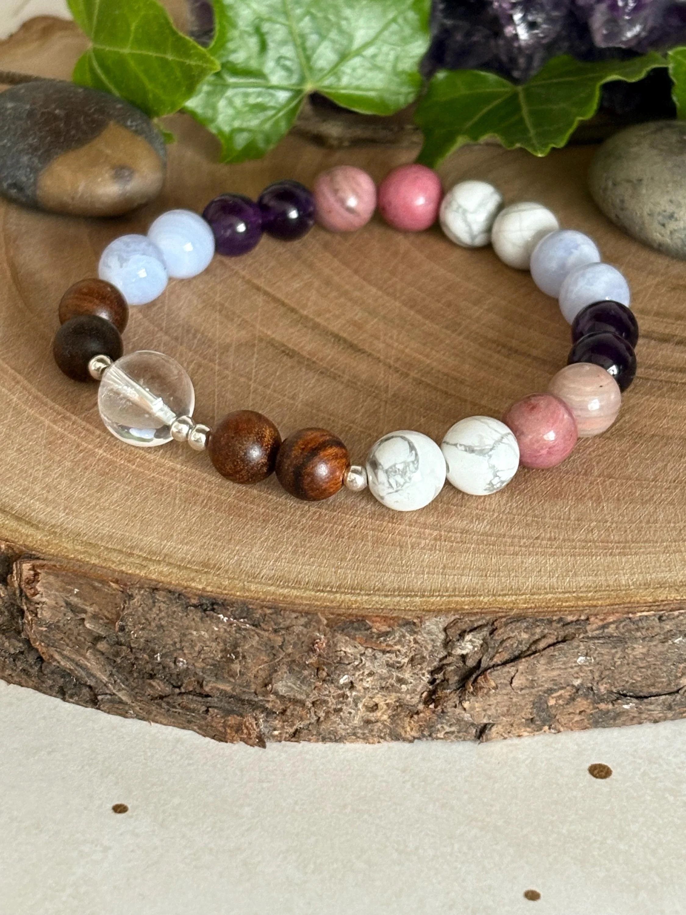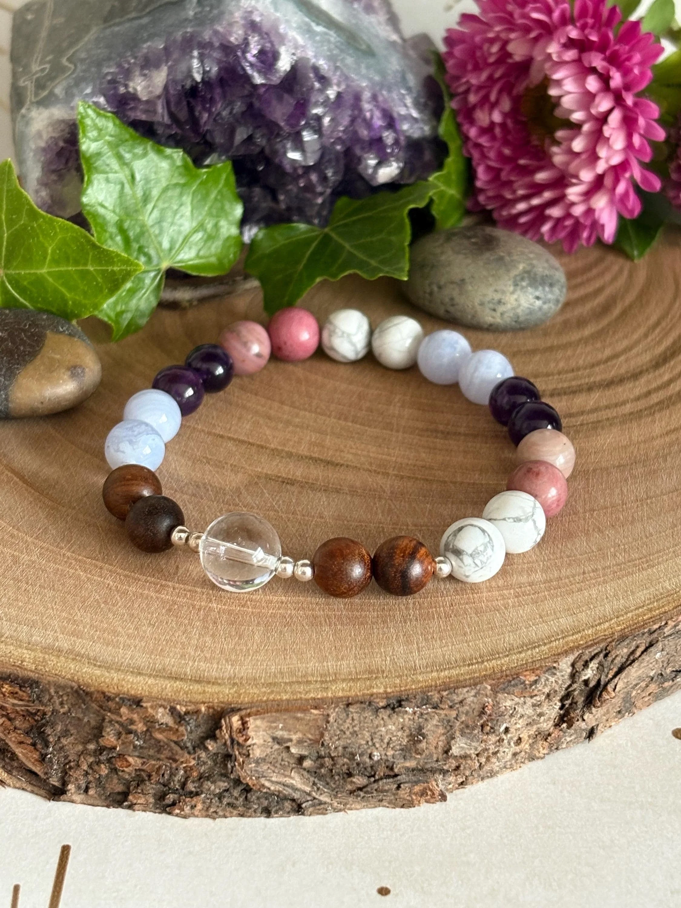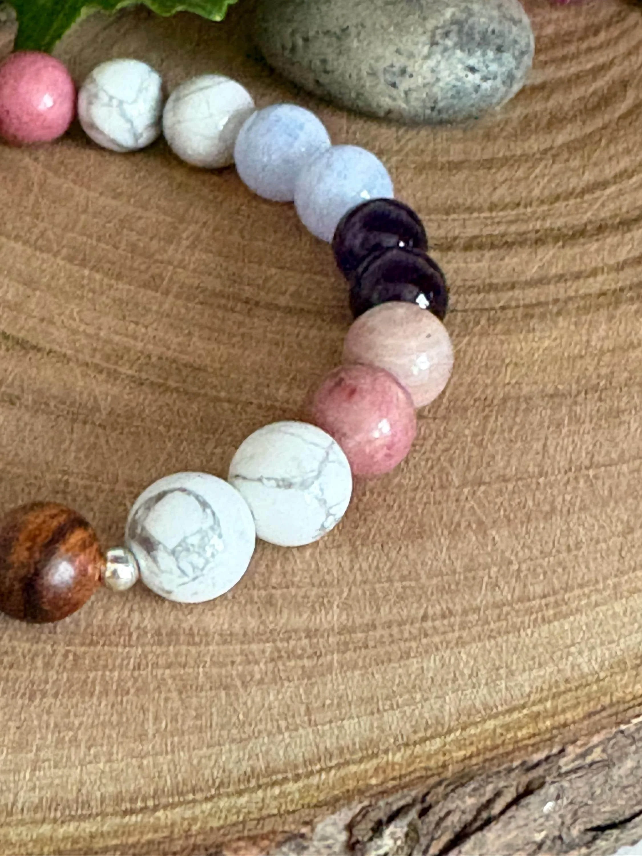 ✔️ Made with A Grade quality 8mm round gemstone beads in blue lace agate, amethyst, rhodonite and howlite, all stones said to holistically support** those dealing with overwhelming feelings.